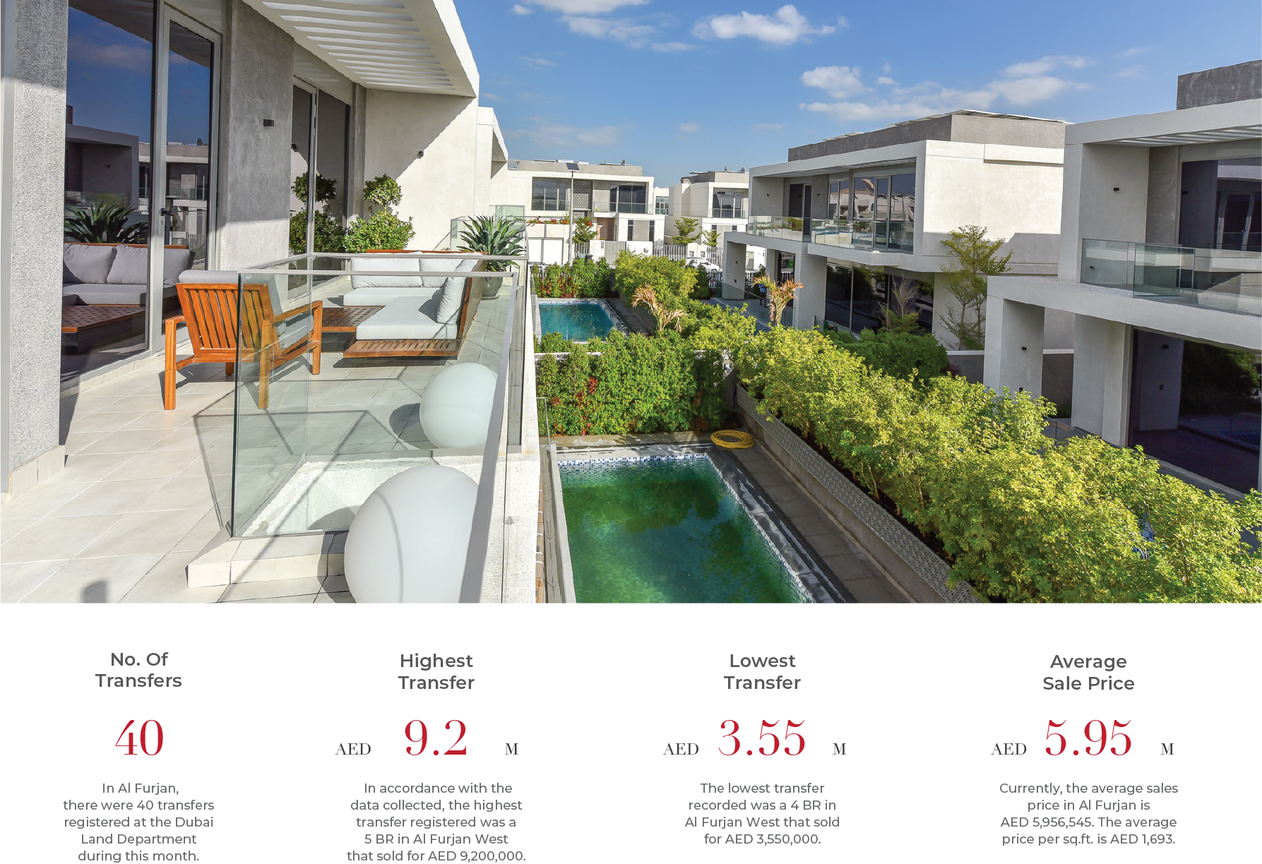 In Al Furjan, there were 40 transfers registered at the Dubai Land Department during this month. In accordance with the data collected, the highest transfer registered was a 5 BR in Al Furjan West that sold for AED 9,200,000. The lowest transfer recorded was a 4 BR in Al Furjan West that sold for AED 3,550,000. Currently, the average sales price in Al Furjan is AED 5,956,545. The average price per sq.ft. is AED 1,693