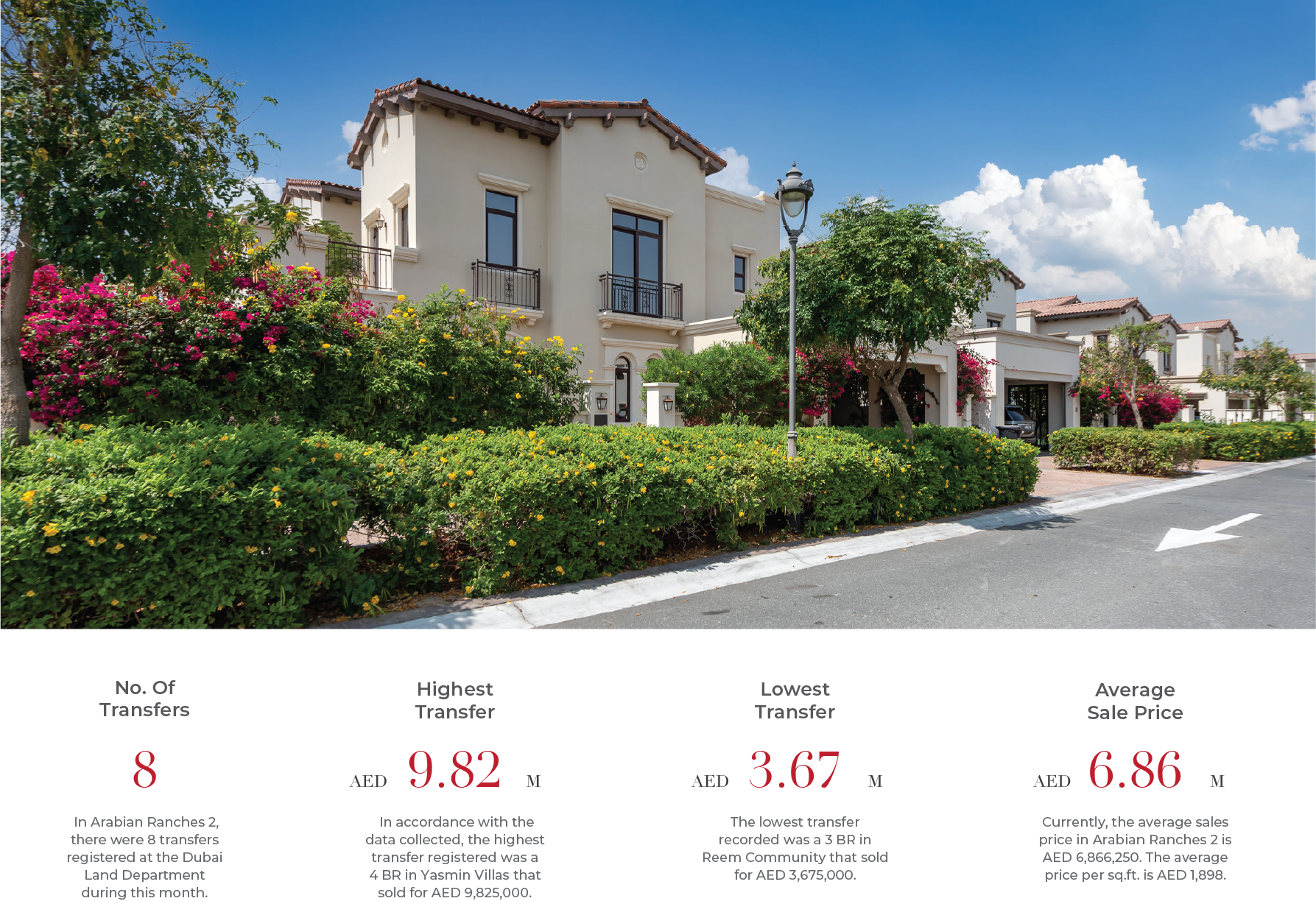 In Arabian Ranches 2, there were 8 transfers registered at the Dubai Land Department during this month. In accordance with the data collected, the highest transfer registered was a 4 BR in Yasmin Villas that sold for AED 9,825,000. The lowest transfer recorded was a 3 BR in Reem Community that sold for AED 3,675,000. Currently, the average sales price in Arabian Ranches 2 is AED 6,866,250. The average price per sq.ft. is AED 1,898.