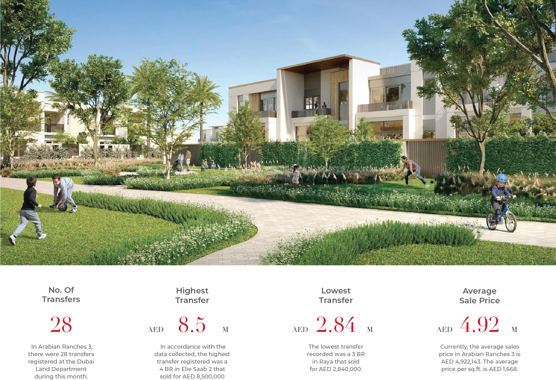 In Arabian Ranches 3, there were 28 transfers registered at the Dubai Land Department during this month.