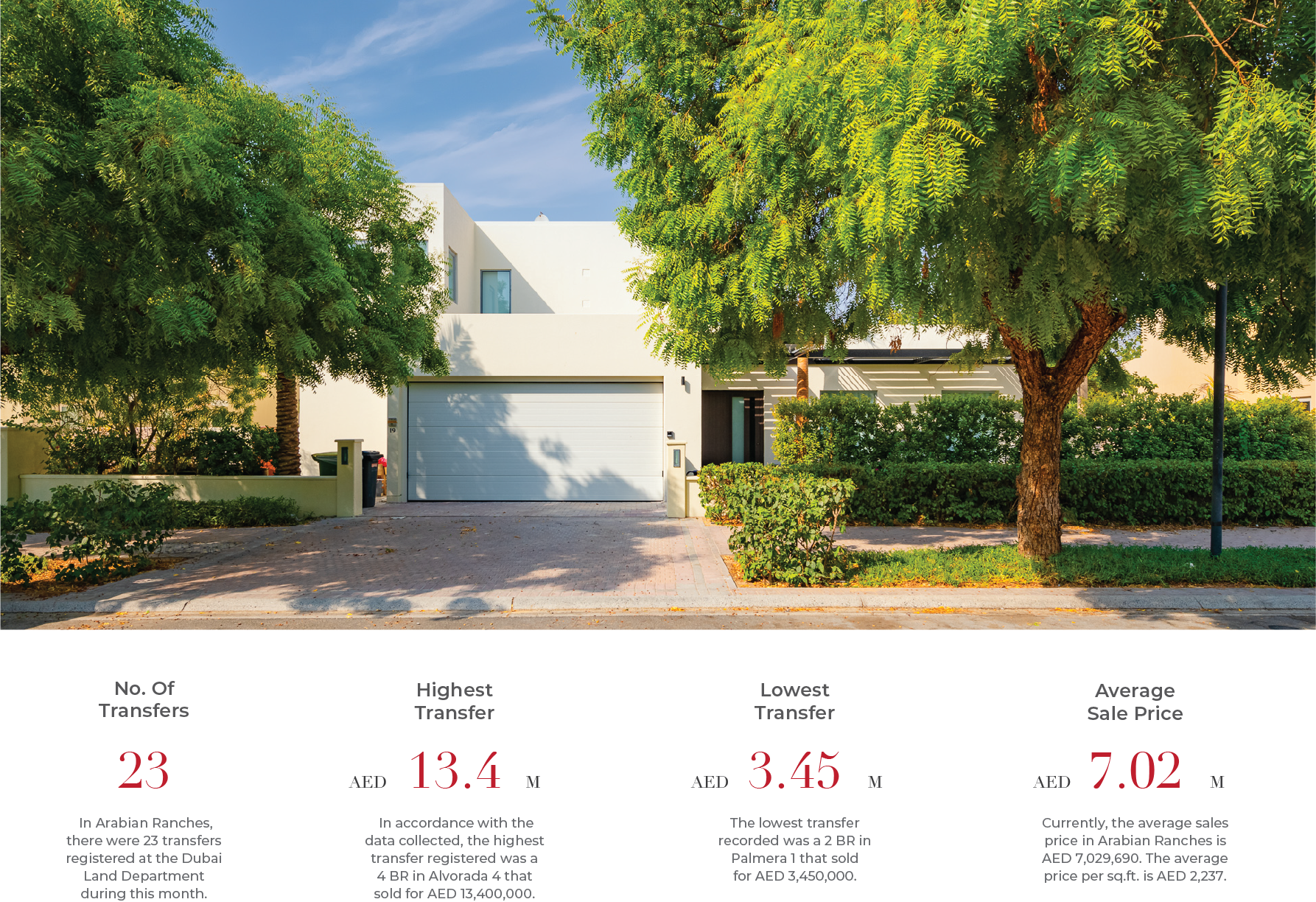 In Arabian Ranches, there were 23 transfers registered at the Dubai Land Department during this month. In accordance with the data collected, the highest transfer registered was a 4 BR in Alvorada 4 that sold for AED 13,400,000. The lowest transfer recorded was a 2 BR in Palmera 1 that sold for AED 3,450,000. Currently, the average sales price in Arabian Ranches is AED 7,029,690. The average price per sq.ft. is AED 2,237