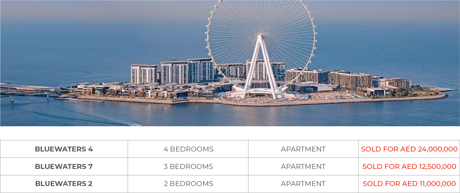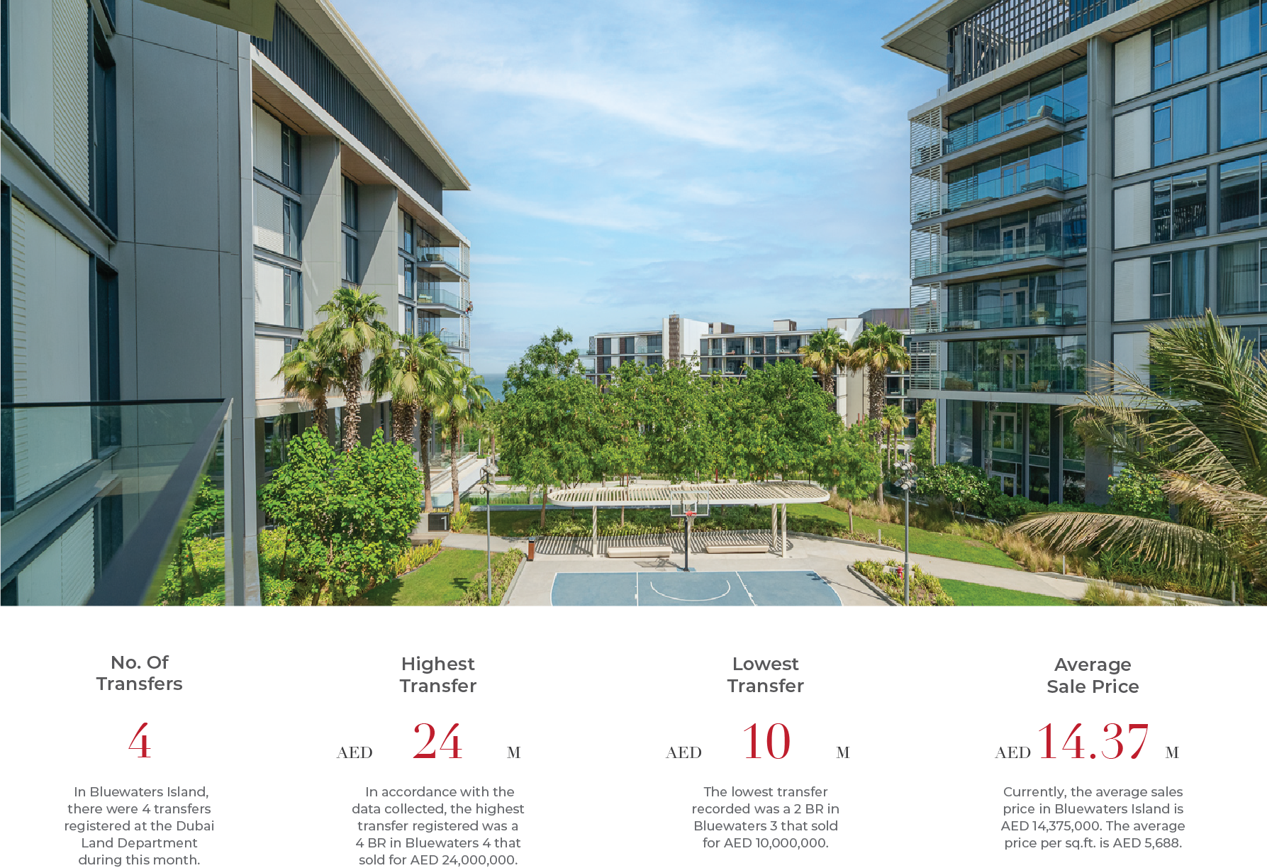 In Bluewaters Island, there were 4 transfers registered at the Dubai Land Department during this month. In accordance with the data collected, the highest transfer registered was a 4 BR in Bluewaters 4 that sold for AED 24,000,000. The lowest transfer recorded was a 2 BR in Bluewaters 3 that sold for AED 10,000,000. Currently, the average sales price in Bluewaters Island is AED 14,375,000. The average price per sq.ft. is AED 5,688