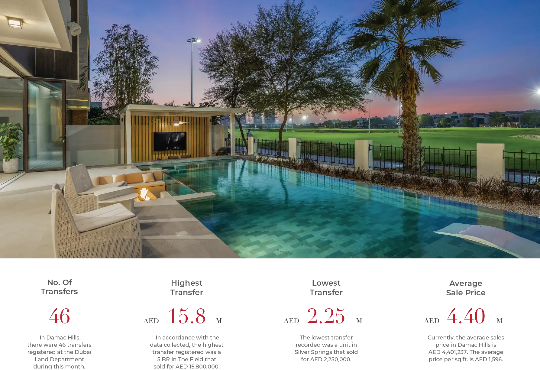 In Damac Hills, there were 46 transfers registered at the Dubai Land Department during this month.In accordance with the data collected, the highest transfer registered was a 5 BR in The Field that sold for AED 15,800,000.The lowest transfer recorded was a unit in Silver Springs that sold for AED 2,250,000.Currently, the average sales price in Damac Hills is AED 4,401,237. The average price per sq.ft. is AED 1,596.