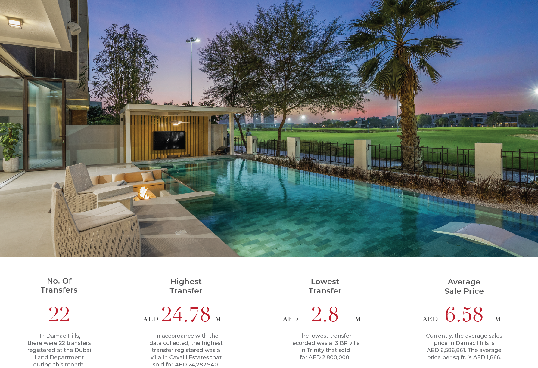 In Damac Hills, there were 22 transfers registered at the Dubai Land Department during this month. In accordance with the data collected, the highest transfer registered was a villa in Cavalli Estates that sold for AED 24,782,940. The lowest transfer recorded was a 3 BR villa in Trinity that sold for AED 2,800,000. Currently, the average sales price in Damac Hills is AED 6,586,861. The average price per sq.ft. is AED 1,866.