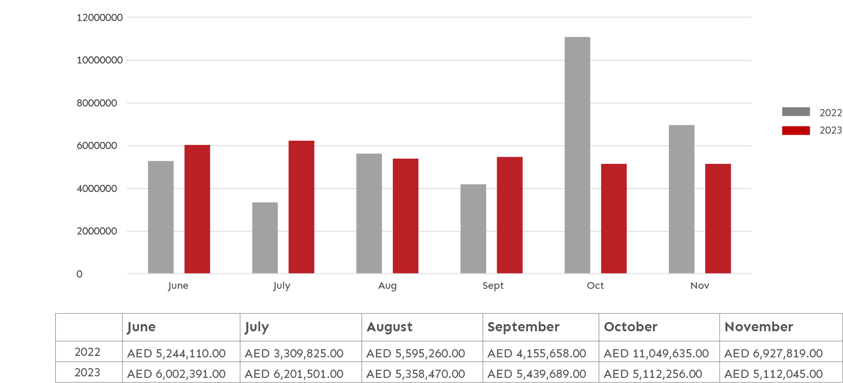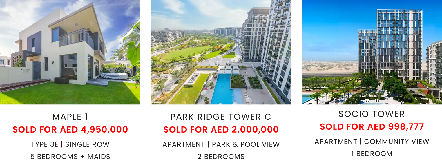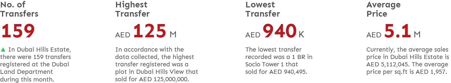 In Dubai Hills Estate, there were 159 transfers registered at the Dubai Land Department during this month. In accordance with the data collected, the highest transfer registered was a plot in Dubai Hills View that sold for AED 125,000,000. The lowest transfer recorded was a 1 BR in Socio Tower 1 that sold for AED 940,495. Currently, the average sales price in Dubai Hills Estate is AED 5,112,045. The average price per sq.ft is AED 1,957.