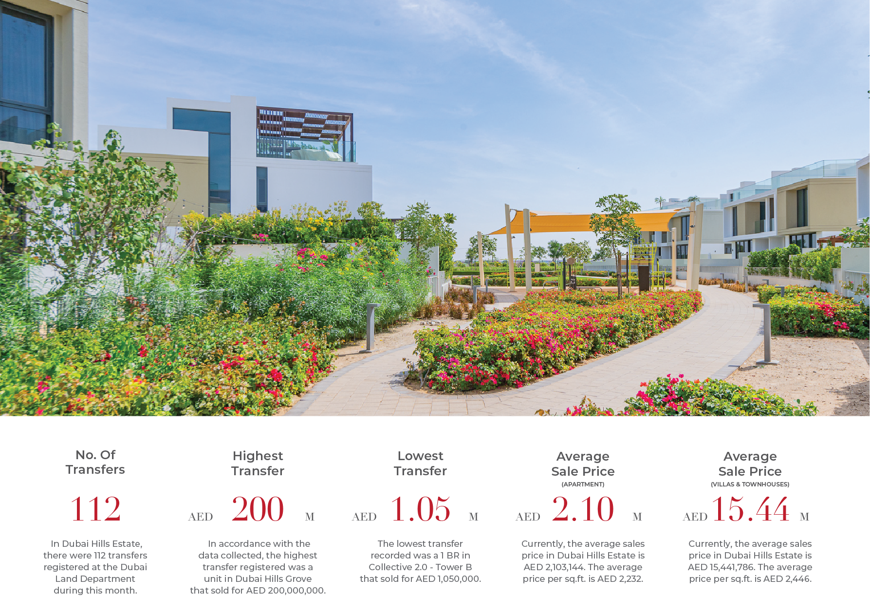 In Dubai Hills Estate, there were 112 transfers registered at the Dubai Land Department during this month. In accordance with the data collected, the highest transfer registered was a unit in Dubai Hills Grove that sold for AED 200,000,000. The lowest transfer recorded was a 1 BR in Collective 2.0 – Tower B that sold for AED 1,050,000. Currently, the average sales price in Dubai Hills Estate is AED 2,103,144. The average price per sq.ft. is AED 2,232. Currently, the average sales price in Dubai Hills Estate is AED 15,441,786. The average price per sq.ft. is AED 2,446.
