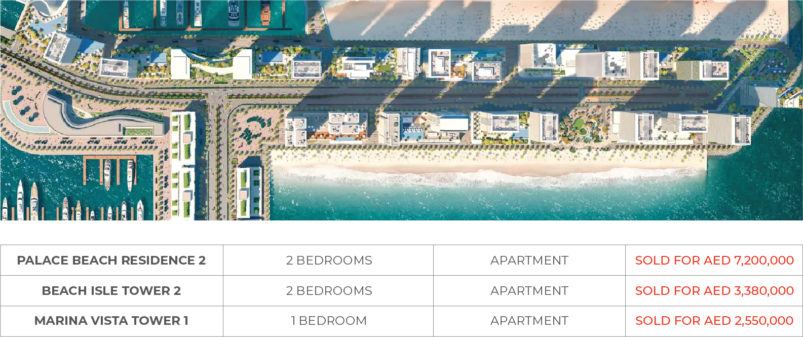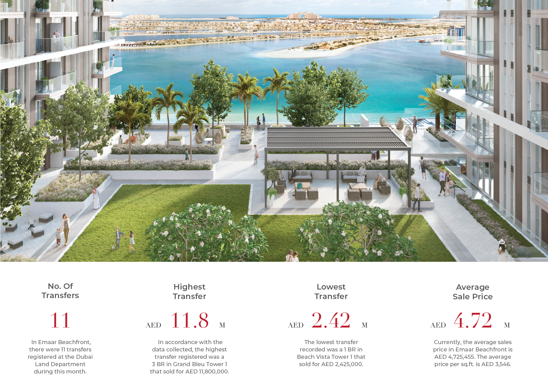 In Emaar Beachfront, there were 11 transfers registered at the Dubai Land Department during this month. In accordance with the data collected, the highest transfer registered was a 3 BR in Grand Bleu Tower 1 that sold for AED 11,800,000. The lowest transfer recorded was a 1 BR in Beach Vista Tower 1 that sold for AED 2,425,000. Currently, the average sales price in Emaar Beachfront is AED 4,725,455. The average price per sq.ft. is AED 3,546.