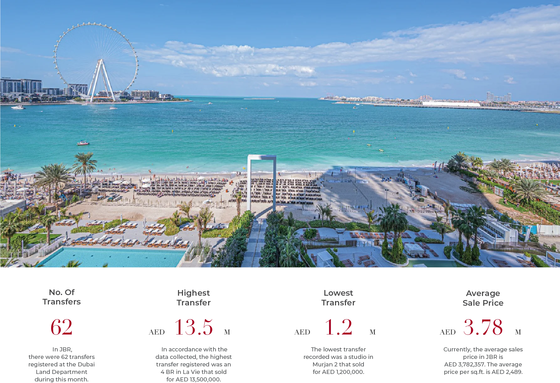 In JBR, there were 62 transfers registered at the Dubai Land Department during this month. In accordance with the data collected, the highest transfer registered was an 4 BR in La Vie that sold for AED 13,500,000. The lowest transfer recorded was a studio in Murjan 2 that sold for AED 1,200,000. Currently, the average sales price in JBR is AED 3,782,357. The average price per sq.ft. is AED 2,489.
