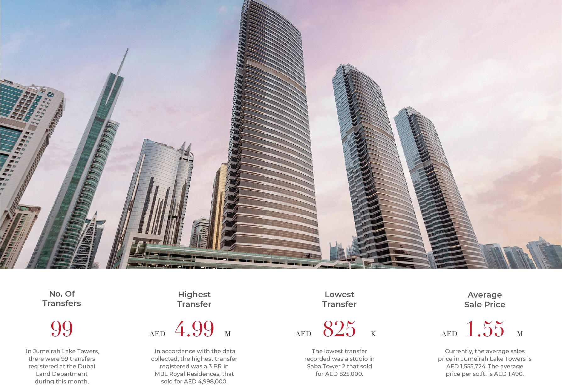 In accordance with the data collected, the highest transfer registered was a 3 bedroom in MBL Royal Residences, that sold for AED 4,998,000. The lowest transfer recorded was a studio in Saba Tower 2 that sold for AED 825,000. Currently, the average sales price in Jumeirah Lake Towers is AED 1,555,724. The average price per sq.ft. is AED 1,490