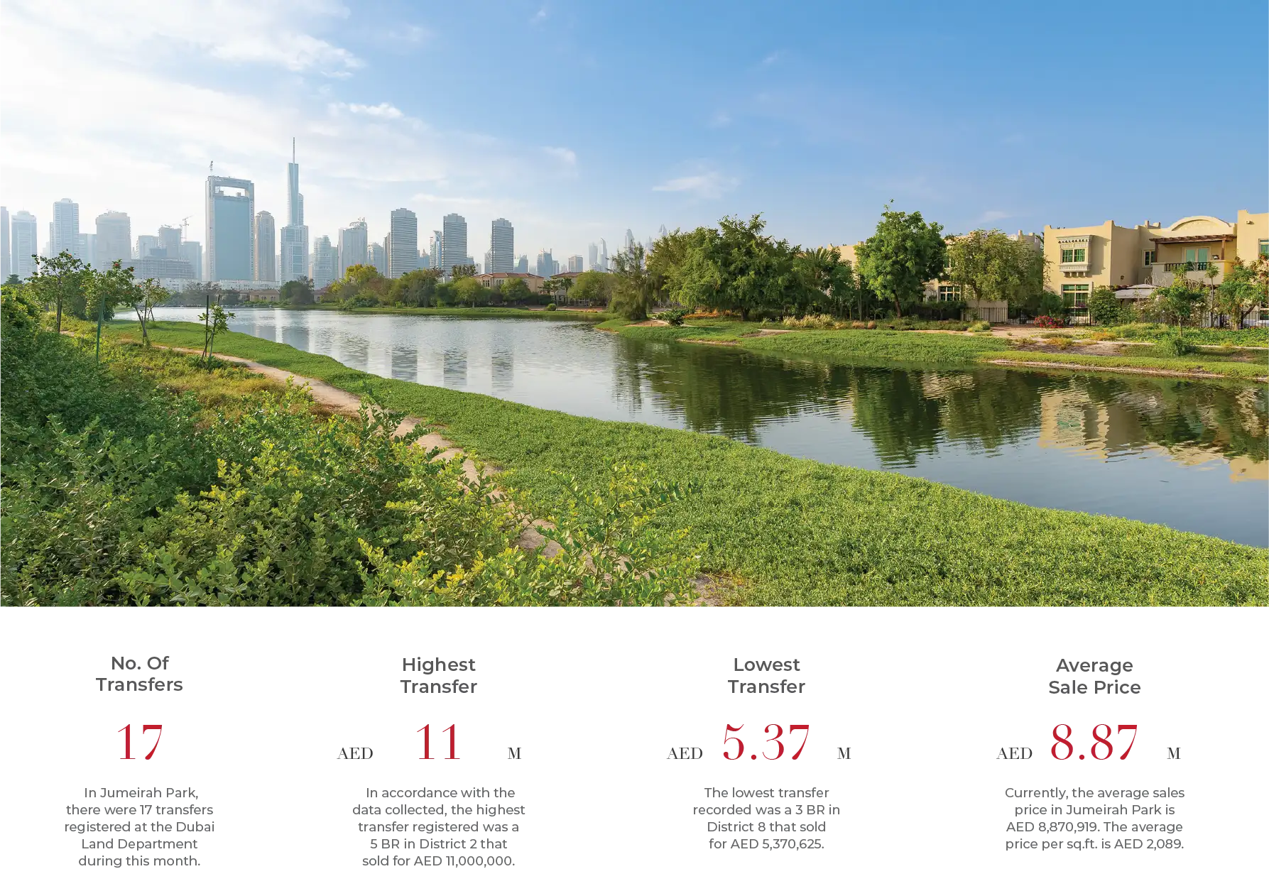 In Jumeirah Park, there were 17 transfers registered at the Dubai Land Department during this month.In accordance with the data collected, the highest transfer registered was a 5 BR in District 2 that sold for AED 11,000,000.The lowest transfer recorded was a 3 BR in District 8 that sold for AED 5,370,625.Currently, the average sales price in Jumeirah Park is AED 8,870,919. The average price per sq.ft. is AED 2,089.