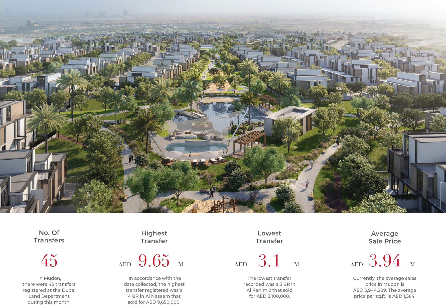 Mudon recorded 45 transfers, with the highest sale reaching AED 9.65M, the highest in the community over the past six months, and the lowest at AED 3.1M. Villas averaged AED 1,564 per sq. ft., reflecting healthy buyer demand. The community continues to attract families with its spacious homes, green spaces, and convenient access to schools, retail, and key transport links.