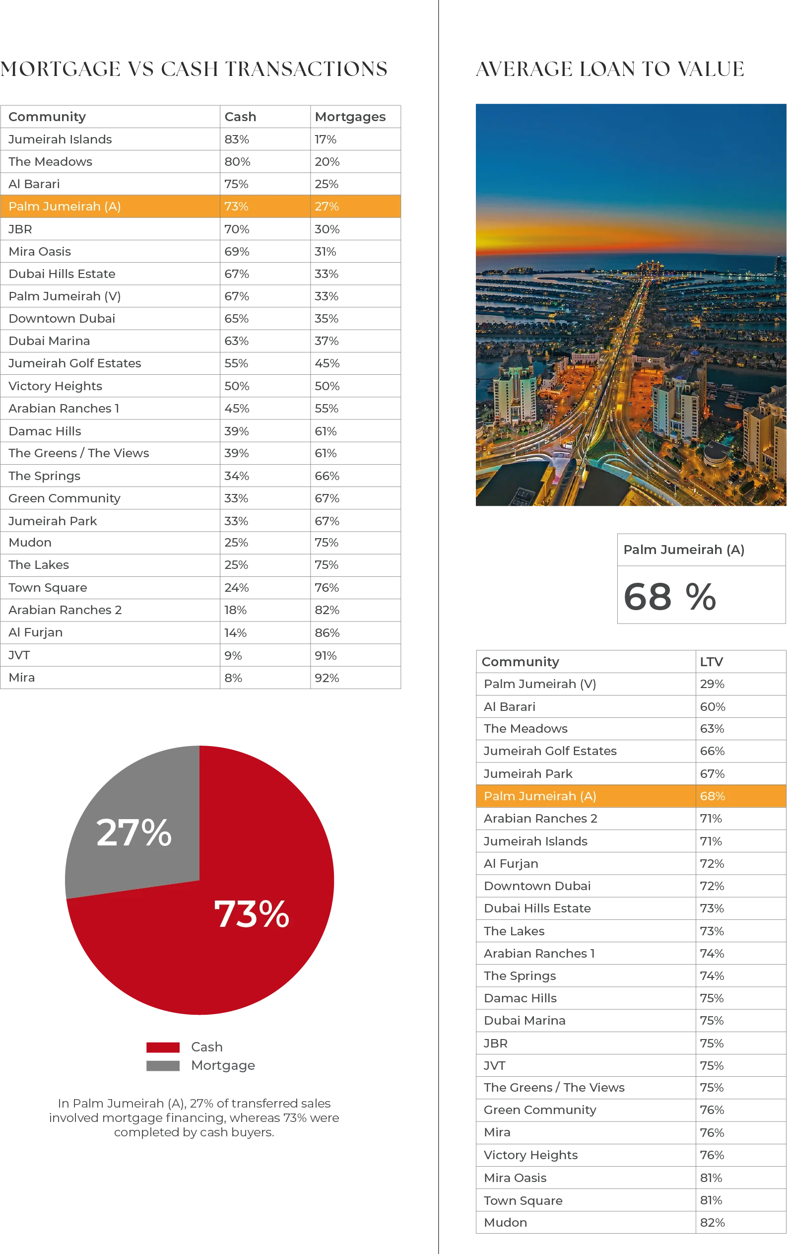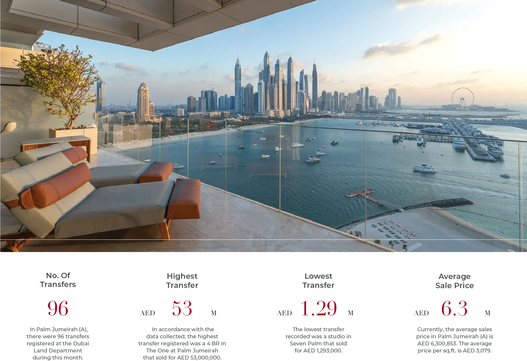 In Palm Jumeirah (A), there were 96 transfers registered at the Dubai Land Department during this month. In accordance with the data collected, the highest transfer registered was a 4 BR in The One at Palm Jumeirah that sold for AED 53,000,000. The lowest transfer recorded was a studio in Seven Palm that sold for AED 1,293,000. Currently, the average sales price in Palm Jumeirah (A) is AED 6,300,853. The average price per sq.ft. is AED 3,079.