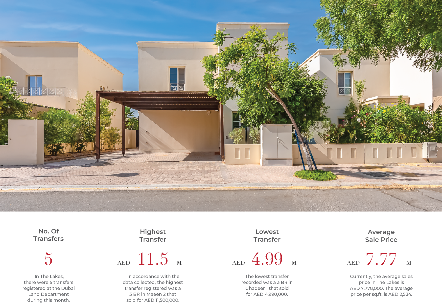 The Lakes saw 5 transfers, with prices ranging from AED 4.99M to AED 11.5M for a 3-bedroom villa, averaging AED 7.77M. Transaction activity has stayed steady over the past six months, pointing to consistent buyer interest. The community remains popular as one of Dubai’s most established neighborhoods, known for its green design and convenient access to Dubai Marina, JLT, and major road links.