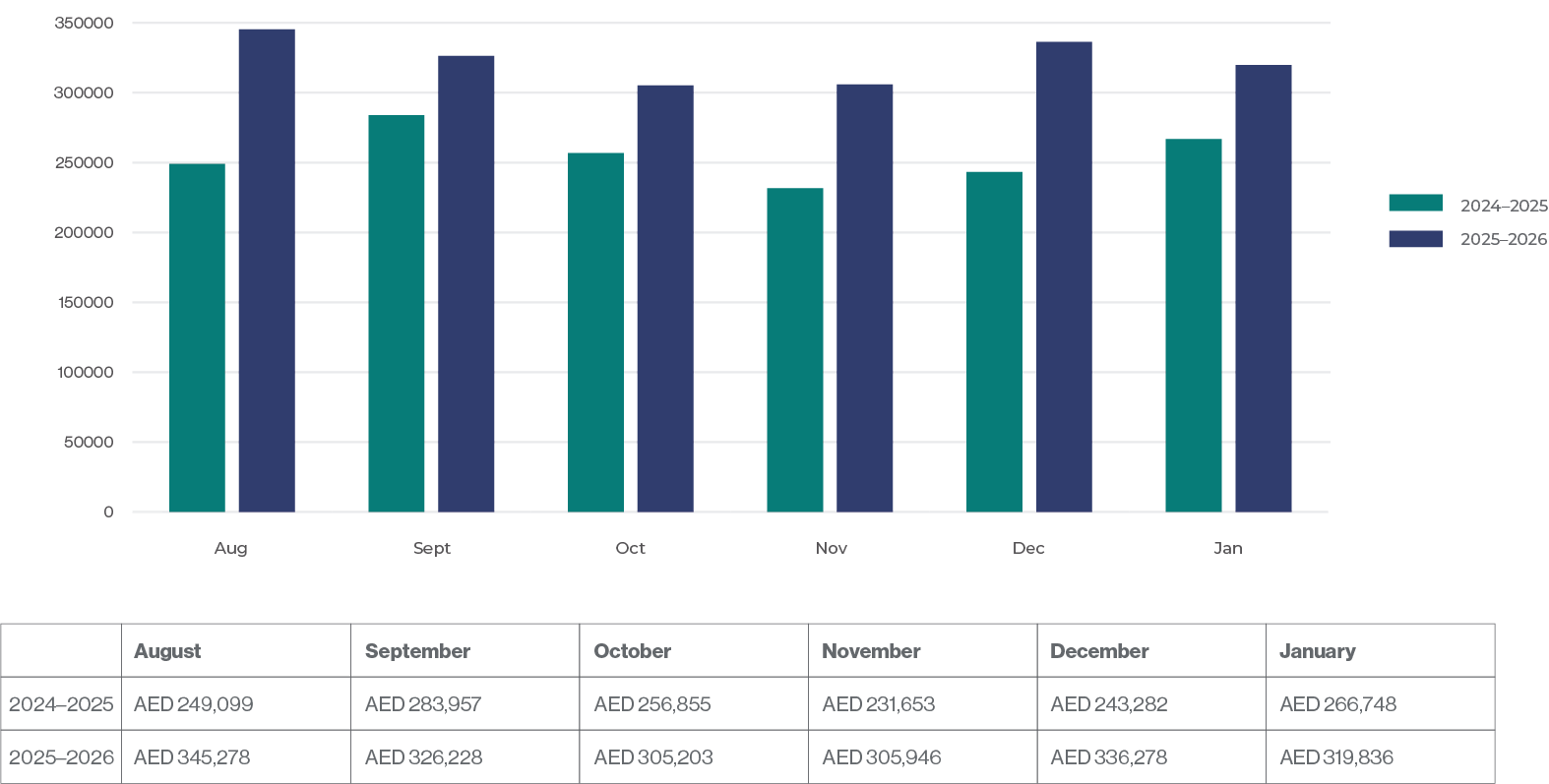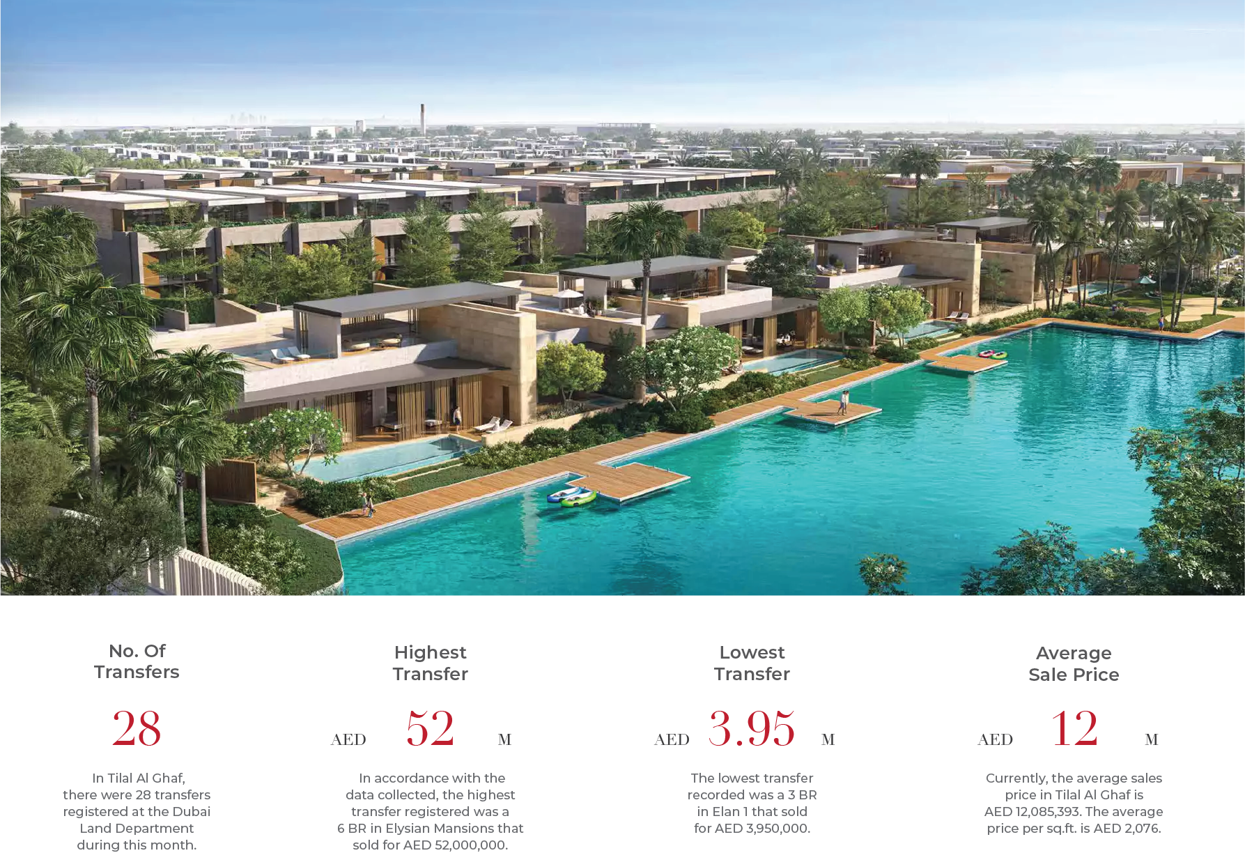 In accordance with the data collected, the highest transfer registered was a 6 bedroom in Elysian Mansions that sold for AED 52,000,000. The lowest transfer recorded was a 3 bedroom in Elan 1 that sold for AED 3,950,000. Currently, the average sales price in Tilal Al Ghaf is AED 12,085,393. The average price per sq.ft. is AED 2,076