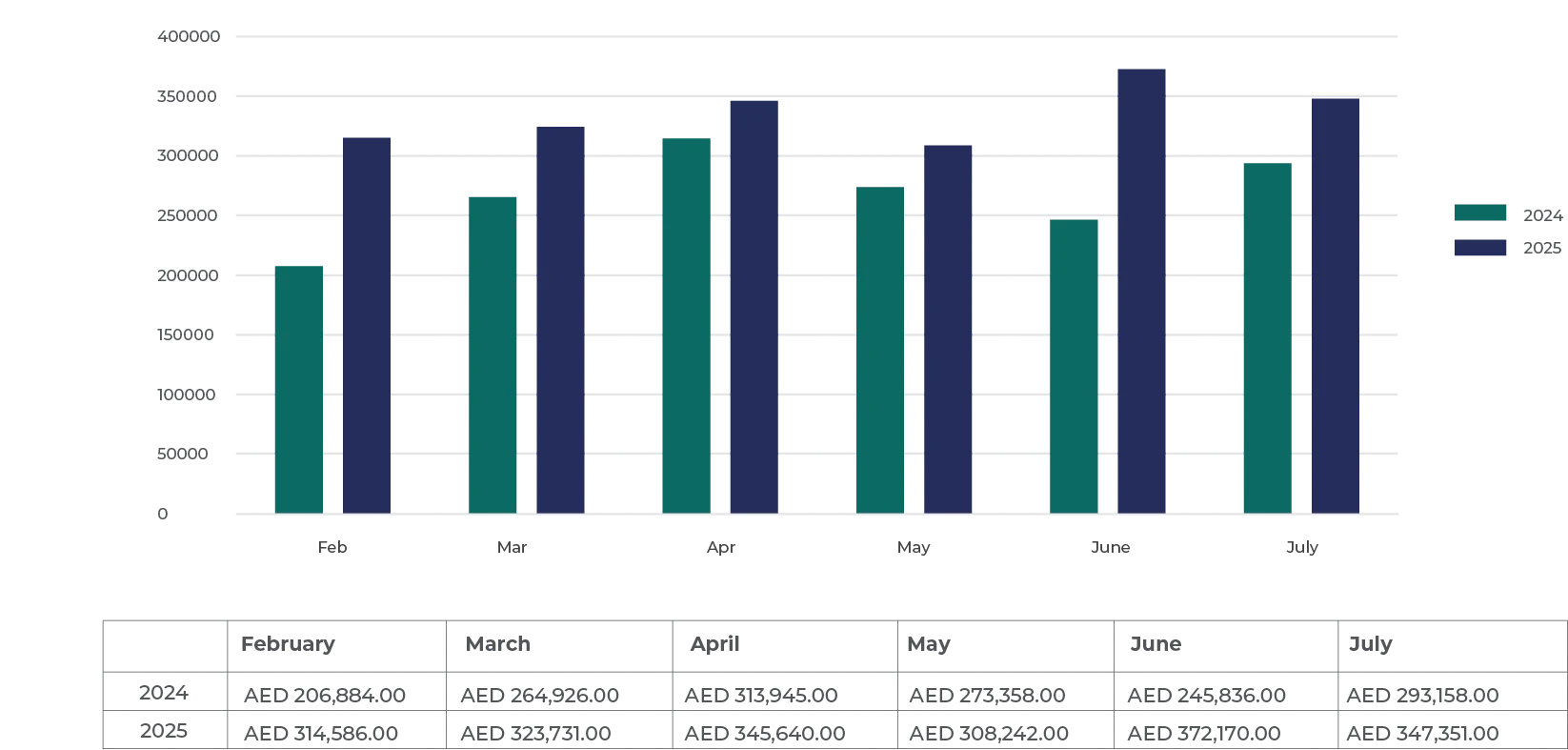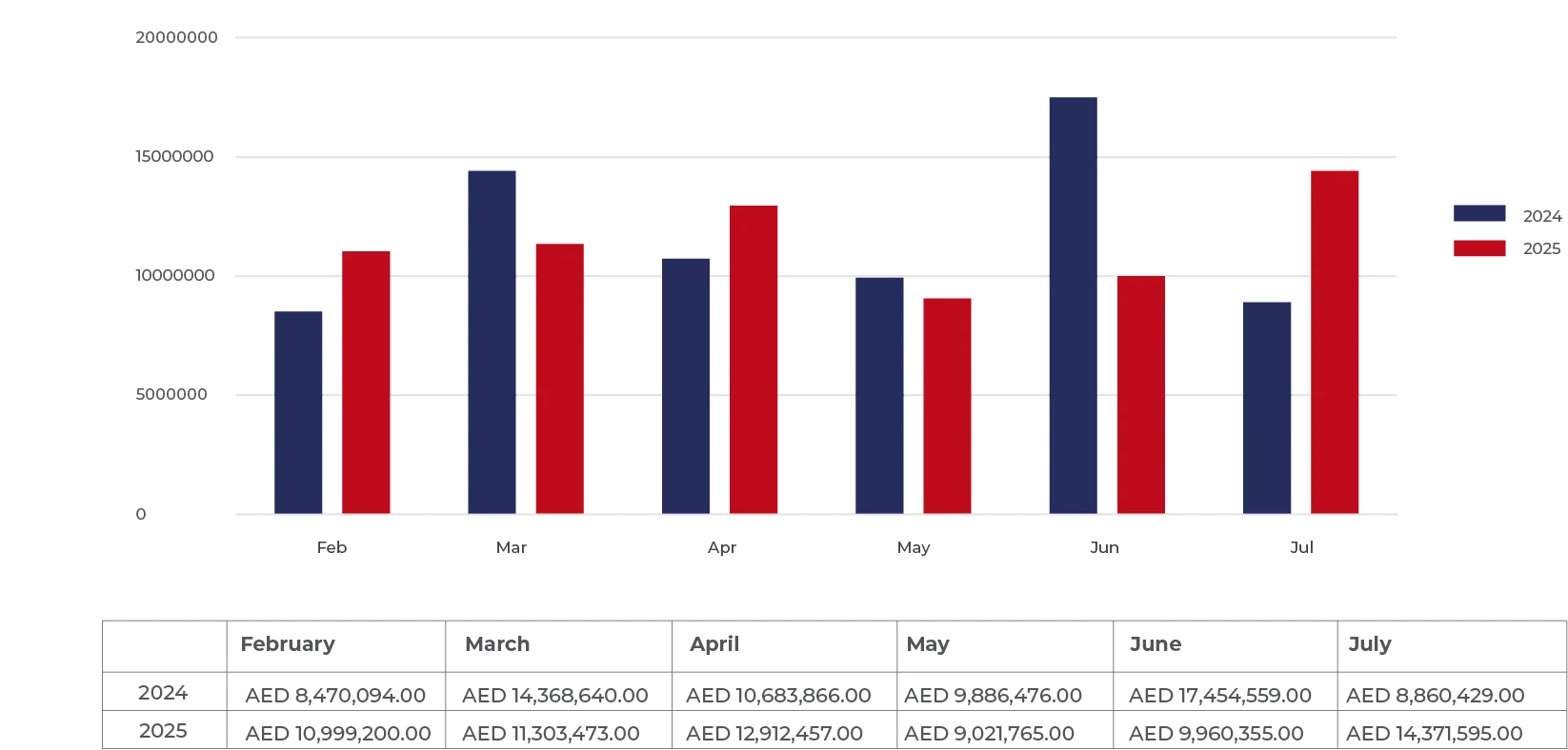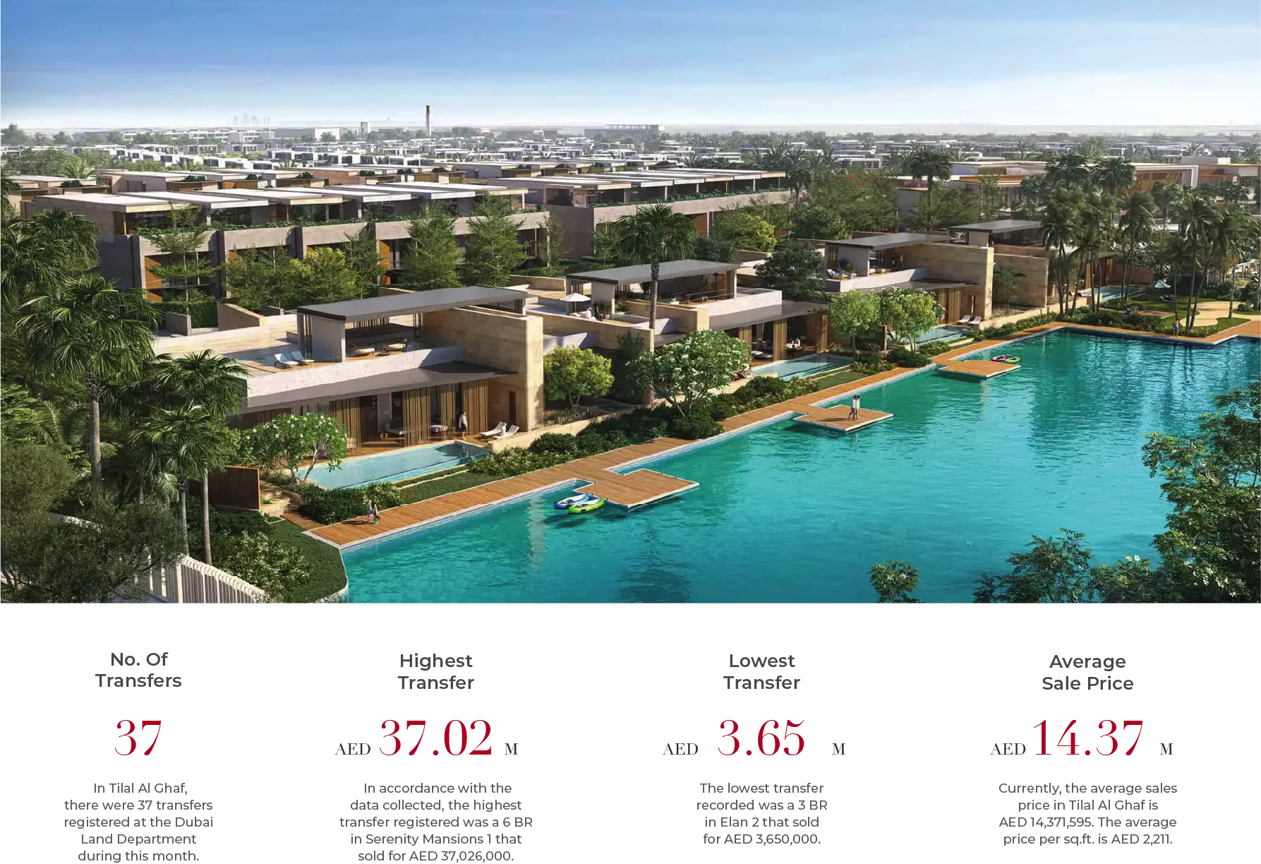 In Tilal Al Ghaf, there were 37 transfers registered at the Dubai Land Department during this month. In accordance with the data collected, the highest transfer registered was a 6 BR in Serenity Mansions 1 that sold for AED 37,026,000. The lowest transfer recorded was a 3 BR in Elan 2 that sold for AED 3,650,000. Currently, the average sales price in Tilal Al Ghaf is AED 14,371,595. The average price per sq.ft. is AED 2,211.