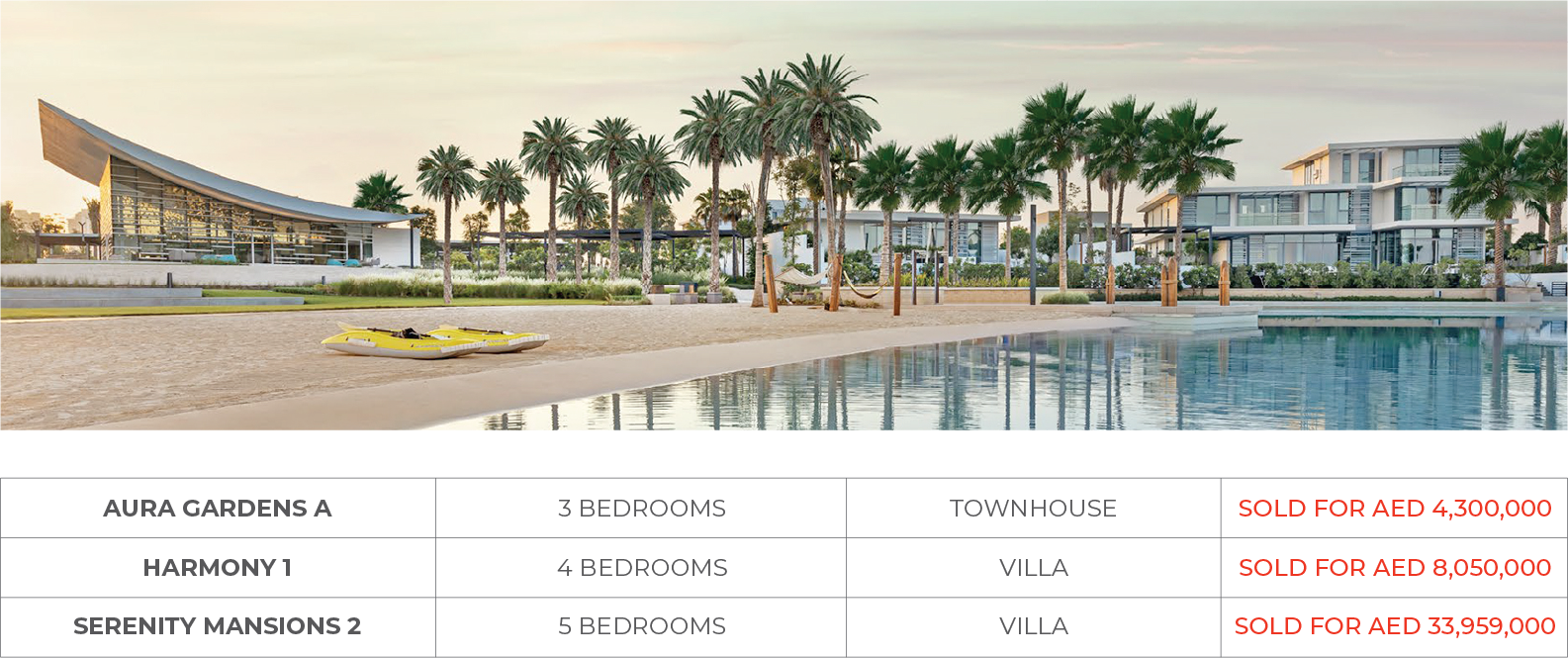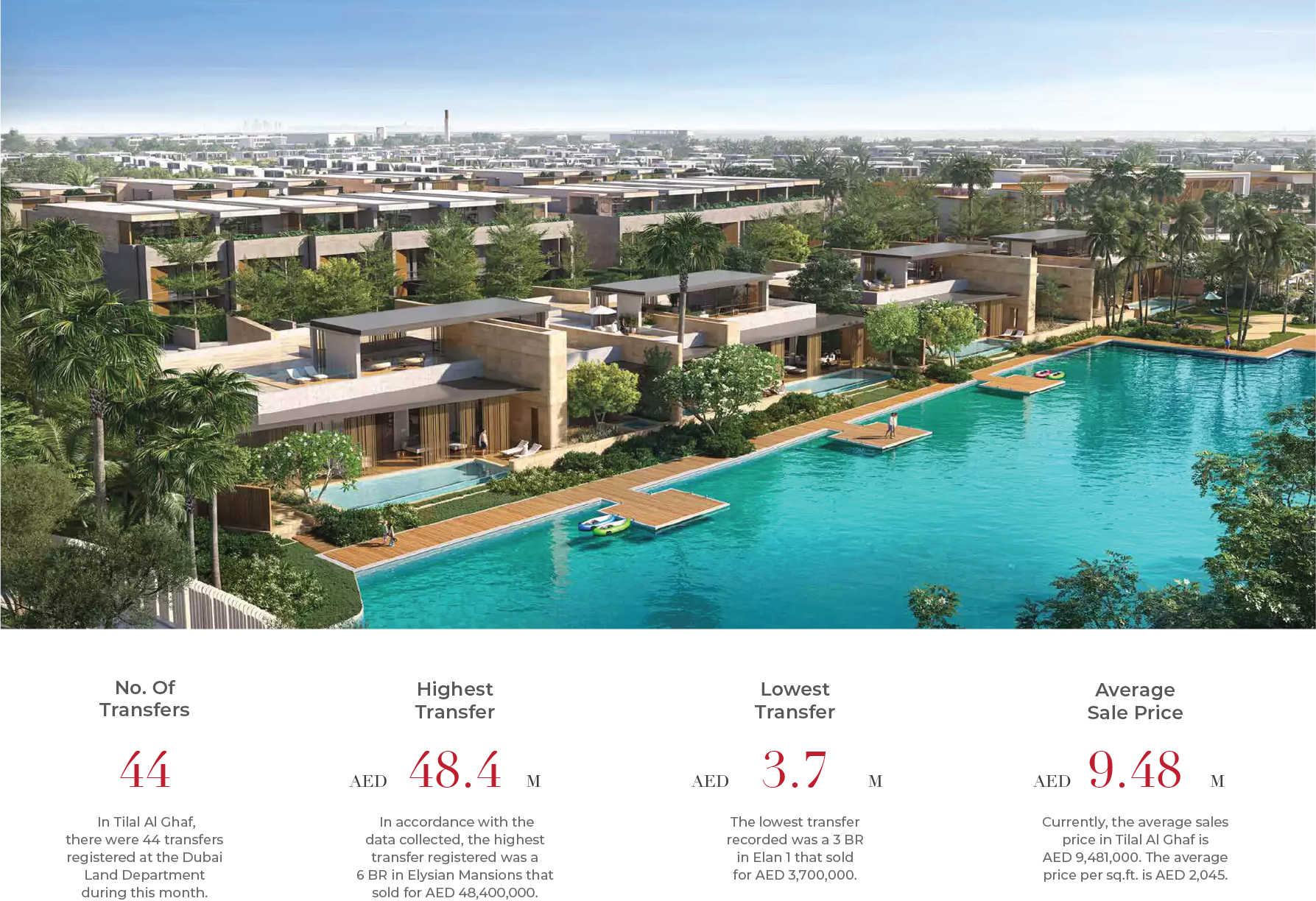 Tilal Al Ghaf recorded 44 transfers, with the highest sale at AED 48.4M and the lowest at AED 3.7M, averaging AED 9.48M. The community’s appeal is growing, with transaction volumes increasing even as average prices eased month-on-month. As a newer development, Tilal Al Ghaf is steadily becoming more established, attracting buyers with its modern homes, waterfront areas, and family-friendly amenities.