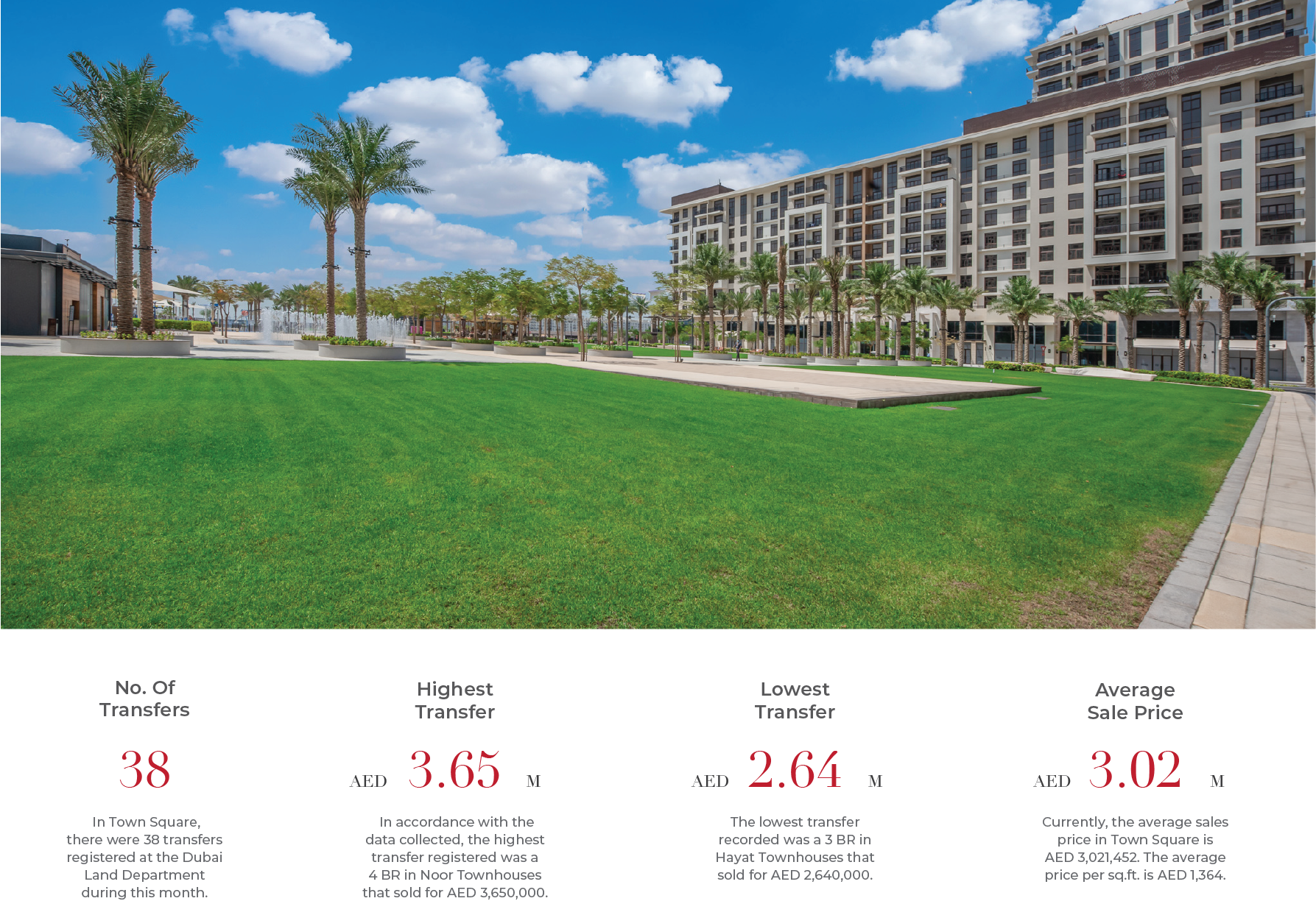 Town Square recorded 38 transfers during the period, with prices ranging from a high of AED 3.65M to a low of AED 2.64M. The average sale price reached AED 3.02M, marking the highest level seen over the past six months and reflecting sustained end-user demand within the community.