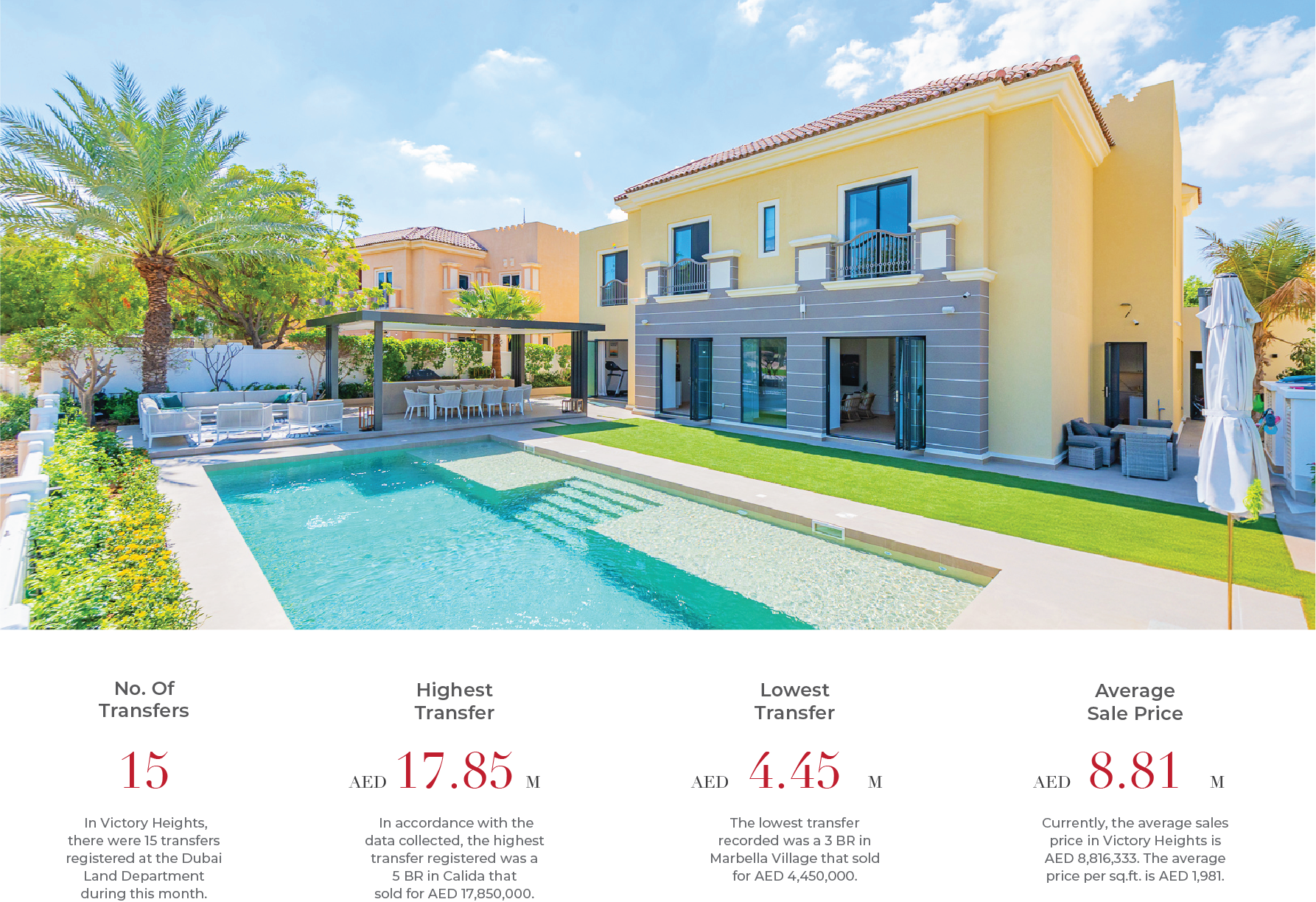 Victory Heights recorded 15 transfers, with the highest sale at AED 17.85M and the lowest at AED 4.45M, averaging AED 8.81M. The community remains highly sought-after for its luxury villas, family-oriented atmosphere, and easy access to premier schools, shopping, and leisure amenities.